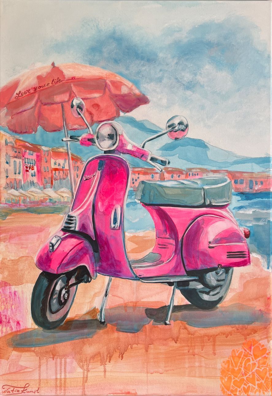 Dieses farbenfrohe Werk fängt das Lebensgefühl des Südens in seiner ganzen Leichtigkeit ein. Im Mittelpunkt steht eine pinkfarbene Vespa, Sinnbild für Freiheit, Freude und das unbeschwerte Reisen. Sie parkt am Ufer mit Blick auf die lebendige Küstenstadt, während im Hintergrund das Meer glitzert und die Berge in sanften Blau- und Grautönen erscheinen.